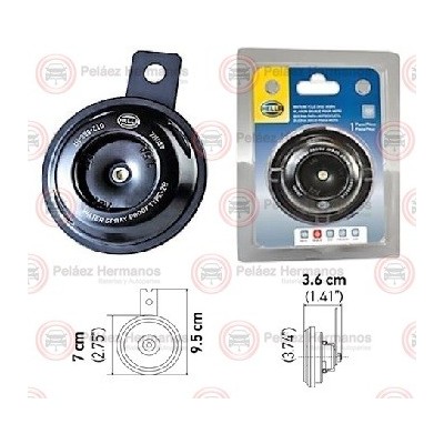 Información Técnica 1: Tono alto, Diámetro: 7 cm. Alto: 9.5 cm., con conexiones planas 6.3 mm. abiertas tipo cuchilla. Especialmente diseñada para motos debido a sus vatios. Color Negro